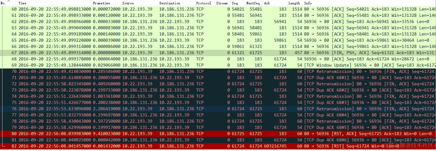 因为在随后的帧 69 中,客户端 10.196.131.236 一没有数据发送,二不发出 FIN/ACK,仅仅只是发送了一个窗口更新的 ACK ,进一步证明了客户端无视了服务器的 FIN。此后服务器进入了 FIN 包的重传阶段,客户端因为继续无视 FIN,不断的产生 TCP Dup ACK 错误。最终服务器在尝试重传 5 次后,直接 RST 了此连接。
