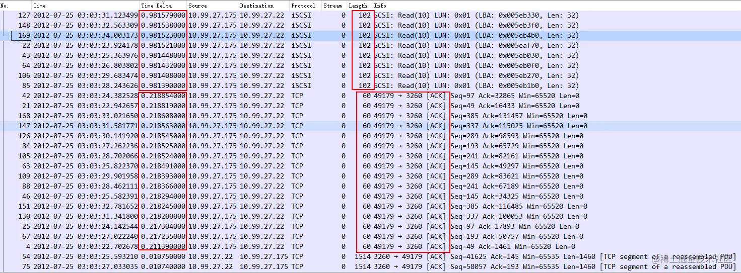 再返回正常数据包排序,看看上述延时发生的情况,以及是否存在一定规律。