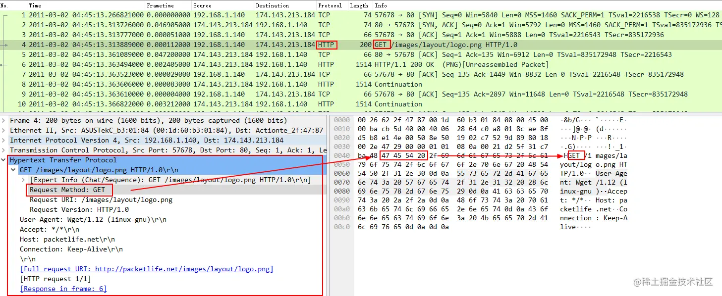 而 'G', 'E', 'T', ' ' ,16 进制值分别对应为 47, 45, 54, 20;取 4 字节即为 GET 。