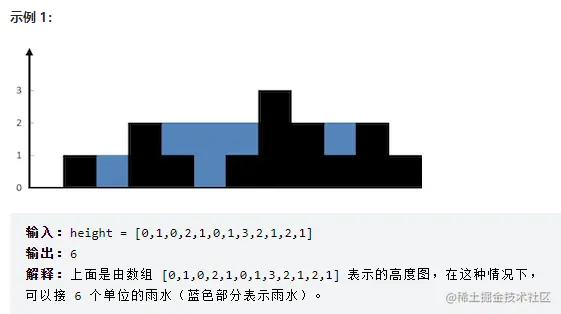 给定 n 个非负整数表示每个宽度为 1 的柱子的高度图,计算按此排列的柱子,下雨之后能接多少雨水。