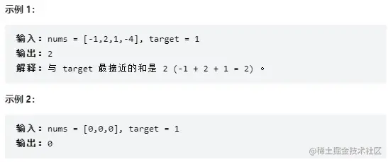 给你一个长度为 n 的整数数组 nums 和 一个目标值 target。请你从 nums 中选出三个整数,使它们的和与 target 最接近。