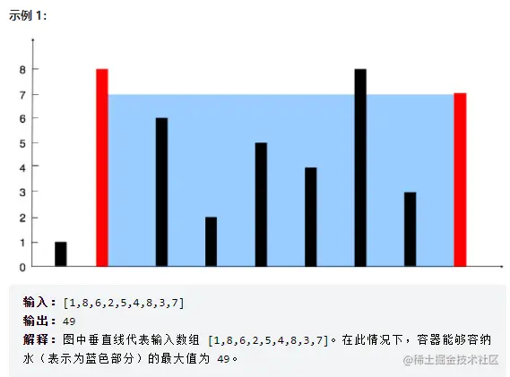 找出其中的两条线,使得它们与 x 轴共同构成的容器可以容纳最多的水。