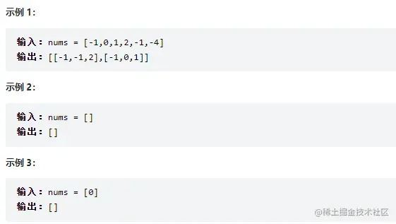 给你一个包含 n 个整数的数组 nums,判断 nums 中是否存在三个元素 a,b,c ,使得 a + b + c = 0 ?请你找出所有和为 0 且不重复的三元组。