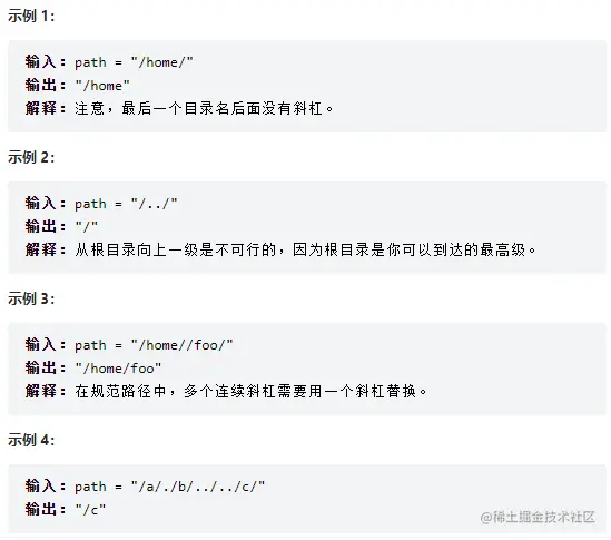 在 Unix 风格的文件系统中,一个点(.)表示当前目录本身;此外,两个点 (..) 表示将目录切换到上一级(指向父目录);两者都可以是复杂相对路径的组成部分。任意多个连续的斜杠(即,'//')都被视为单个斜杠 '/' 。 对于此问题,任何其他格式的点(例如,'...')均被视为文件/目录名称。