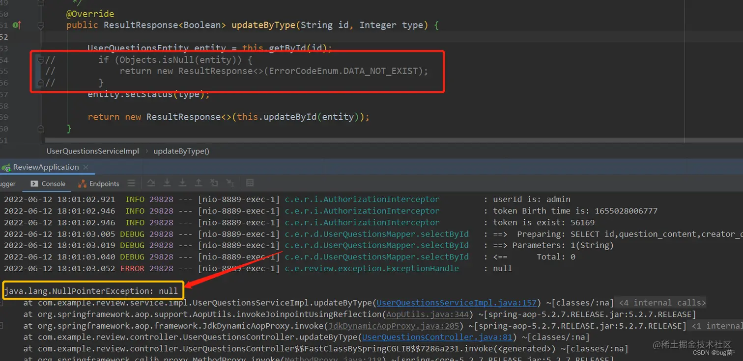大家请看,是不是报错了,空指针吧。所以一般这种更新方法,你们都要多留个心眼,倘若Entity为null,执行update()方法肯定是会报错的。所以我把判空放开,直接返回自定义msg,这样就能有效杜绝更新报错了。大家请看: