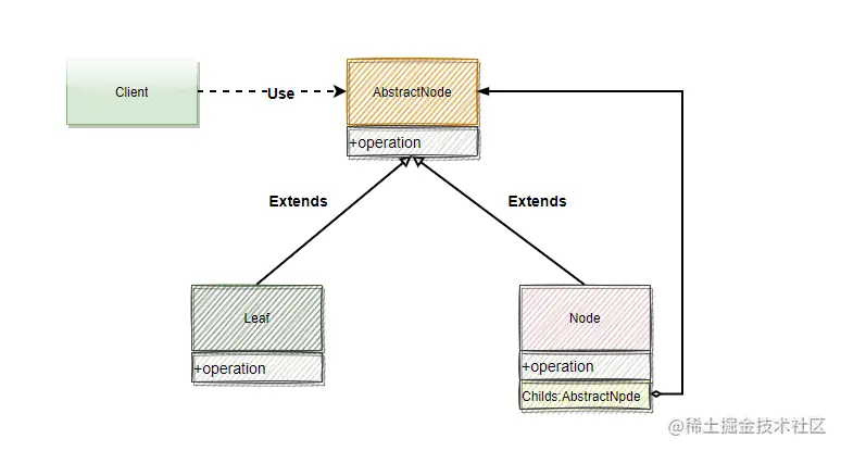 叶子节点:下面不会有其它节点(与组合几点唯一的差距就是没有子节点)
