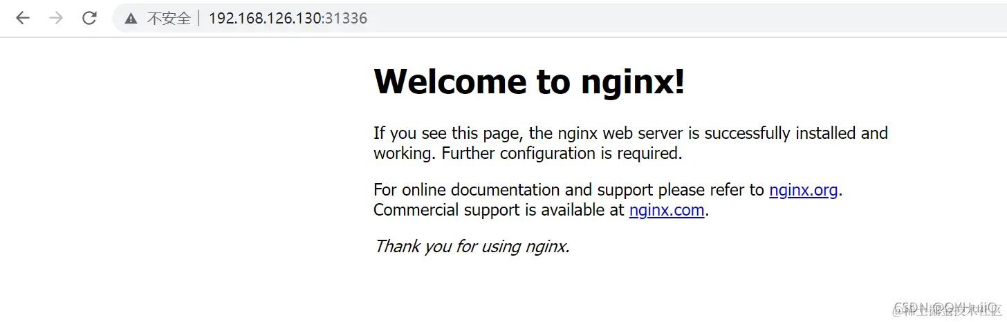 这里的80是用于node之间通信的端口,比如说当前有多个node节点时,node之间对该nginx应用进行访问的时候使用80端口。而冒号后面的31336这个端口是用于外部对nginx的访问,比如我们通过浏览器对nginx服务进行访问时,通过80端口是访问不到的,必须通过31336这个端口。一般来讲,这个端口是一个3开头的五位随机数。
