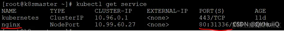 [root@k8smaster ~]# kubectl expose deployment nginx --port=80 --type=NodePort