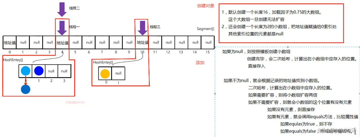 5,当链表的长度大于等于8时,自动转换成红黑树6,以链表或者红黑树头结点为锁对象,配合悲观锁保证多线程 操作集合时数据的安全性
