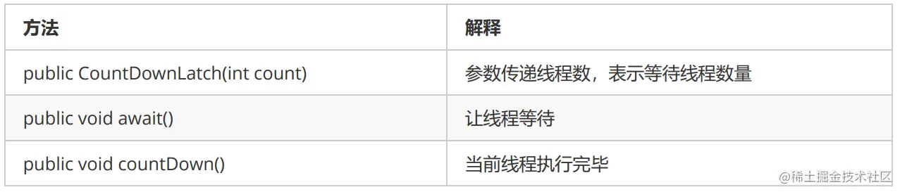 - CountDownLatch(int count):参数写等待线程的数量。并定义了一个计数器。