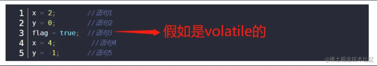 上述代码,语句1和2,不会被重排到3的后面,4和5也不会到3的前面。但是1和2的顺序、4和5的顺序无法保证。