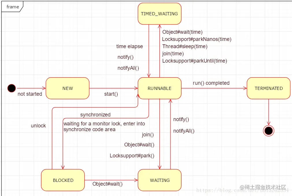 NEW、RUNNABLE、BLOCKED、WAITING、TIMED_WAITING、TERMINATED