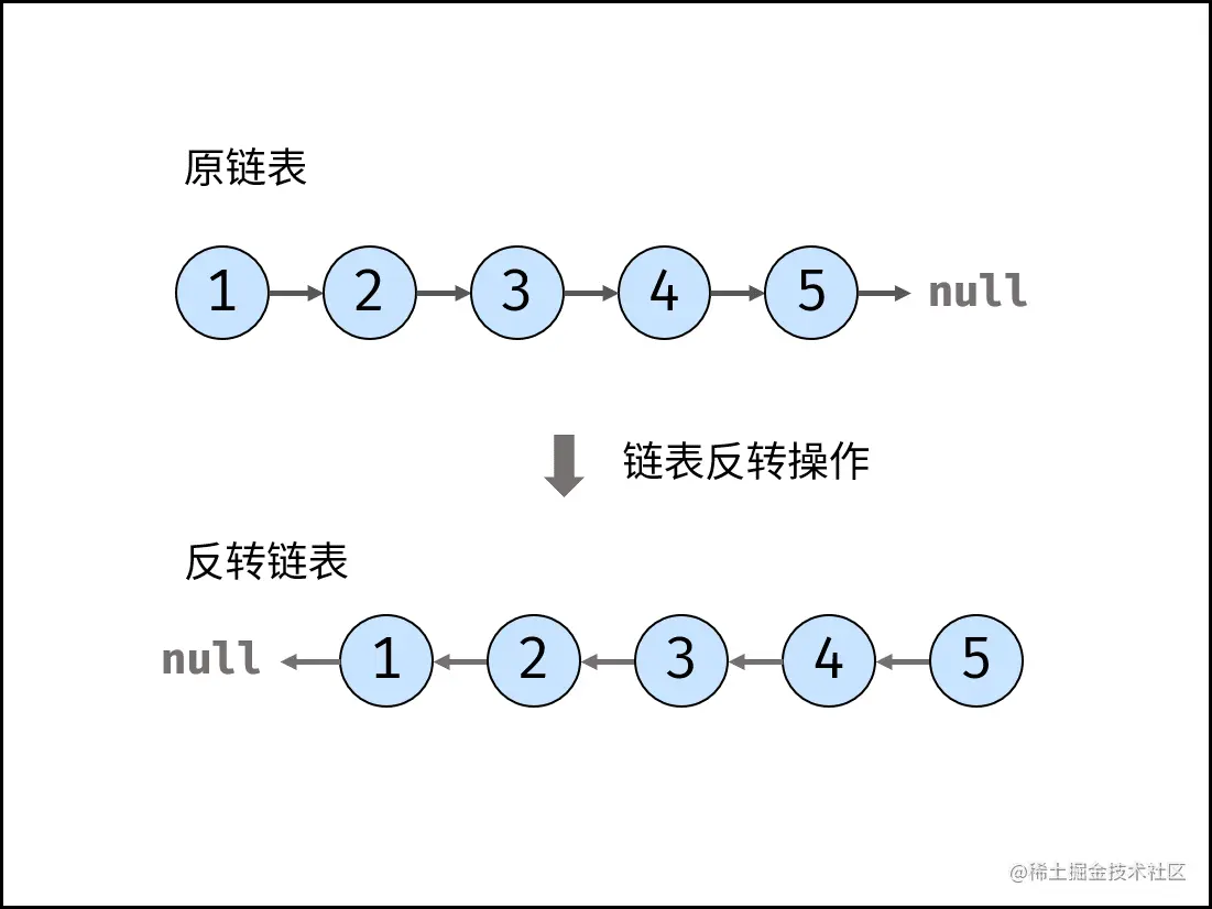 如下图所示,题目要求将链表反转。有迭代(双指针)、递归两种实现方法。