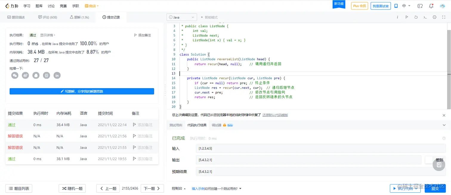 cur为空,则返回尾节点pre(即反转链表的头节点); - 递归后继节点,记录返回值(即反转链表的头节点)为