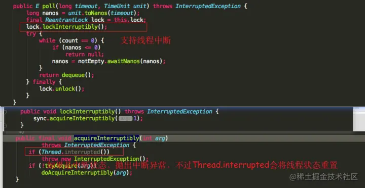 这里网友可能会想到线程不是已经是中断状态了吗?那么调用poll和take方法时,应该会一直抛出InterruptedException异常才对。如果对AQS比较熟悉的话,应该可以想到不会出现这种情况,我们再来看poll和task调用的方法