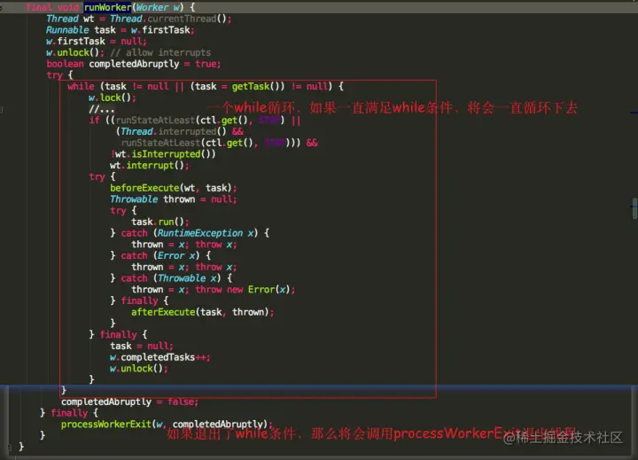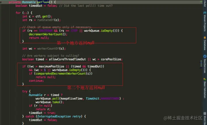 可以看到runWorker方法中,首先会将firstTask赋值给Runnable task变量,firstTask是工作线程第一次跑的时候执行的任务,然后随后就将firstTask=null,即firstTask只会执行一次。接下来就进入while条件循环,如果while条件循环不满足,最后就会进入到finally中的processWorkerExit线程退出,也就从线程池Set中remove线程。所以我们可以把重点关注在while的条件上,第一个条件task != null是用来判断第一次跑的任务,后面的getTask()方法里获取任务,接下来就看getTask()方法,看看getTask()方法什么时候给我们返回null,就代表着这个while条件结束,也就会进入到我们的processWorkerExit()线程退出方法
