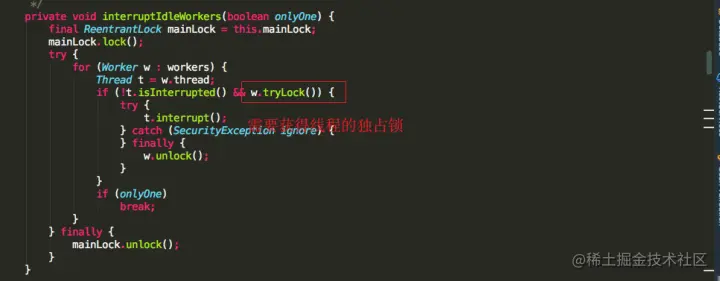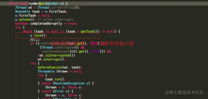 我们可以看到interruptIdleWorkers方法,向线程发出中断信号前,需要获得tryLock()获取独占锁,才能执行t.interrupt()方法,我们再返过头来看runWorker()方法