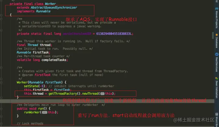 会发现Worker的构造方法会利用创建线程工厂创建一个新线程,并且将当前this对象赋值给了thread成员变量,重写了run()方法,也至于上一张图所指出的thread.start()启动线程会调用Worker对象run()方法,后面重点来看run()方法。