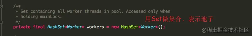 重点看addWorker()方法,这里我们要联想到线程池是一个池子,从方法名也可以看出addWorker()增加一个工作者,那么这个Worker对象肯定会放到池子里面去,我们能想到这个池子肯定是一个集合,比如List,Set,Map都可以
