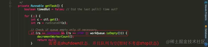 返回null的条件需要两个,一个是shutdown状态,还有一个是队列为空,没有任务(暂时不考虑stop状态)。如果队列中还存在任务,则会调用poll或者take获取任务