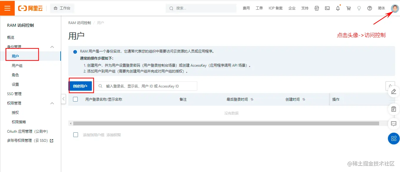 右上角点击【访问控制】 ,创建用户,访问方式勾选“Open API 调用访问”,会生成AccessKey ID 和 AccessKeySecret,之后配置PicGo需要用到。然后对这个用户进行权限管理,选择 AliyunOSSFullAccess——管理对象存储服务(OSS)权限。