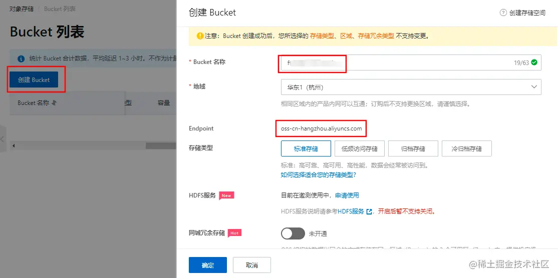确认存储区域 就是上面的 Endpoint的地址 ,比如你的是oss-cn-beijing.aliyuncs.com 那么这里就是 oss-cn-beijing,去掉阿里云的后缀