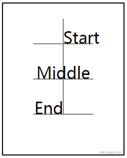 SVG中的文本对齐与CSS中的略有不同,当起点对齐时,第一个字符会贴着参考线;当居中对齐时,文本的中间位置会被参考线贯穿;当终点对齐时,文本的最后一个字符会贴着参考线。