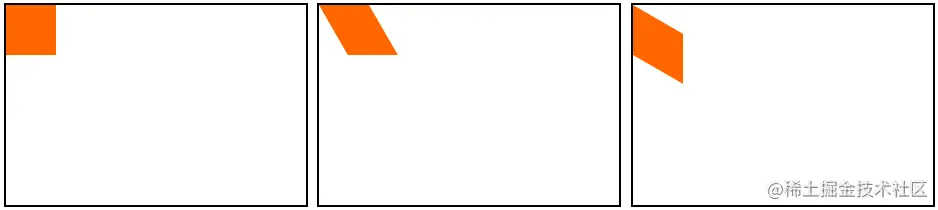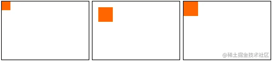 接下来修改两个最小坐标(如图2所示),第一个<svg>元素声明的最小坐标为(20,20),虽然矩形的坐标是(0,0),但是比最小坐标要小,所以就会往左上角偏移;第二个<svg>元素声明了负数坐标,与前一个正好相反;在第三个<svg>元素中,修改了矩形的坐标,正好在左上角。