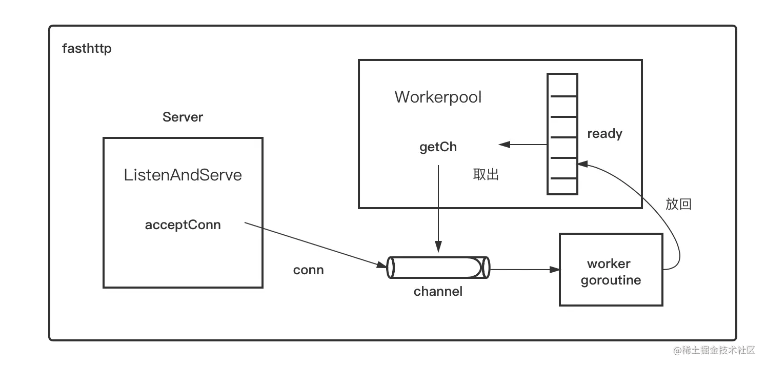 而fasthttp设计了一套机制,目的是尽量复用goroutine,而不是每次都创建新的goroutine。fasthttp的Server accept一个conn之后,会尝试从workerpool中的ready切片中取出一个channel,该channel与某个worker goroutine一一对应。一旦取出channel,就会将accept到的conn写到该channel里,而channel另一端的worker goroutine就会处理该conn上的数据读写。当处理完该conn后,该worker goroutine不会退出,而是会将自己对应的那个channel重新放回workerpool中的ready切片中,等待这下一次被取出。