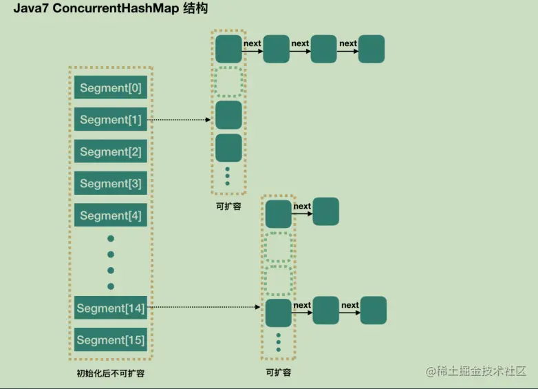 java7里面:默认16个Segment,用于降低锁粒度。也就是我们说的分段锁。