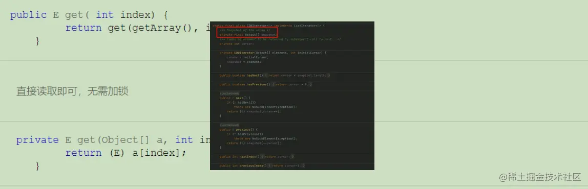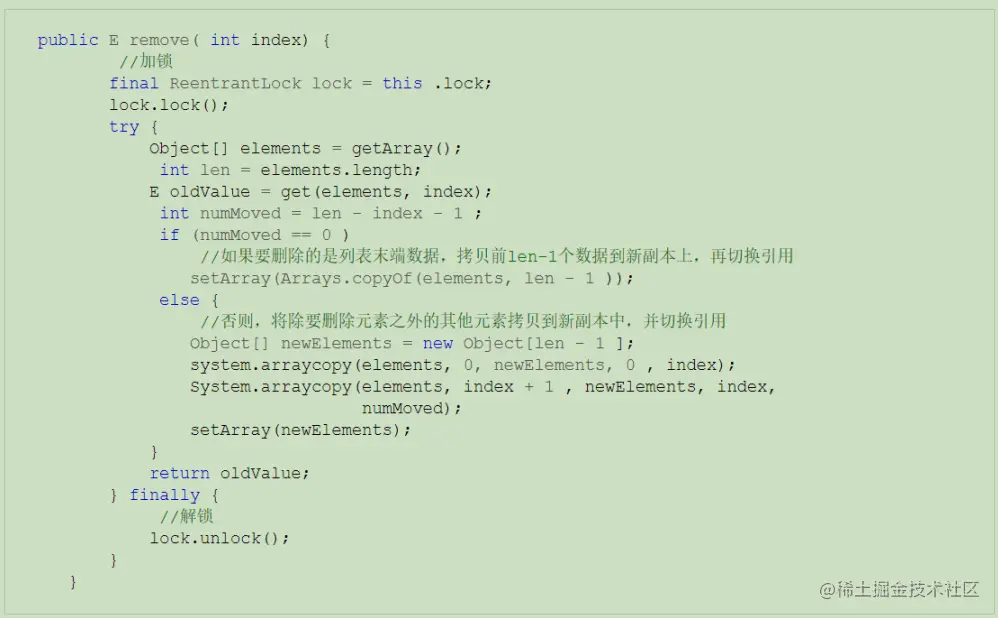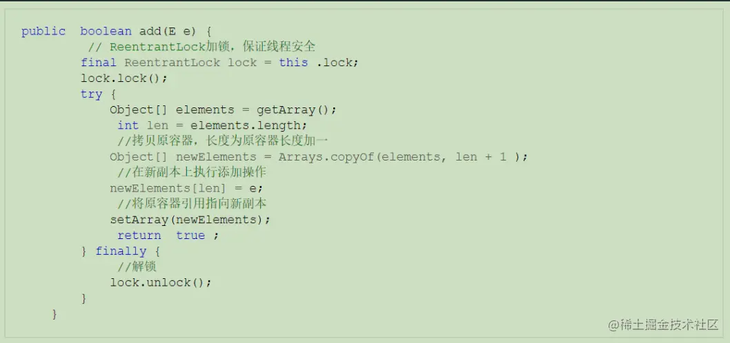 原理:写加锁,保证写不会混乱。写在一个Copy的副本上,而不是原始数据上。写完之后将原来数组的引用指向新副本。(用volatile保证切换过程对读线程立即可见)