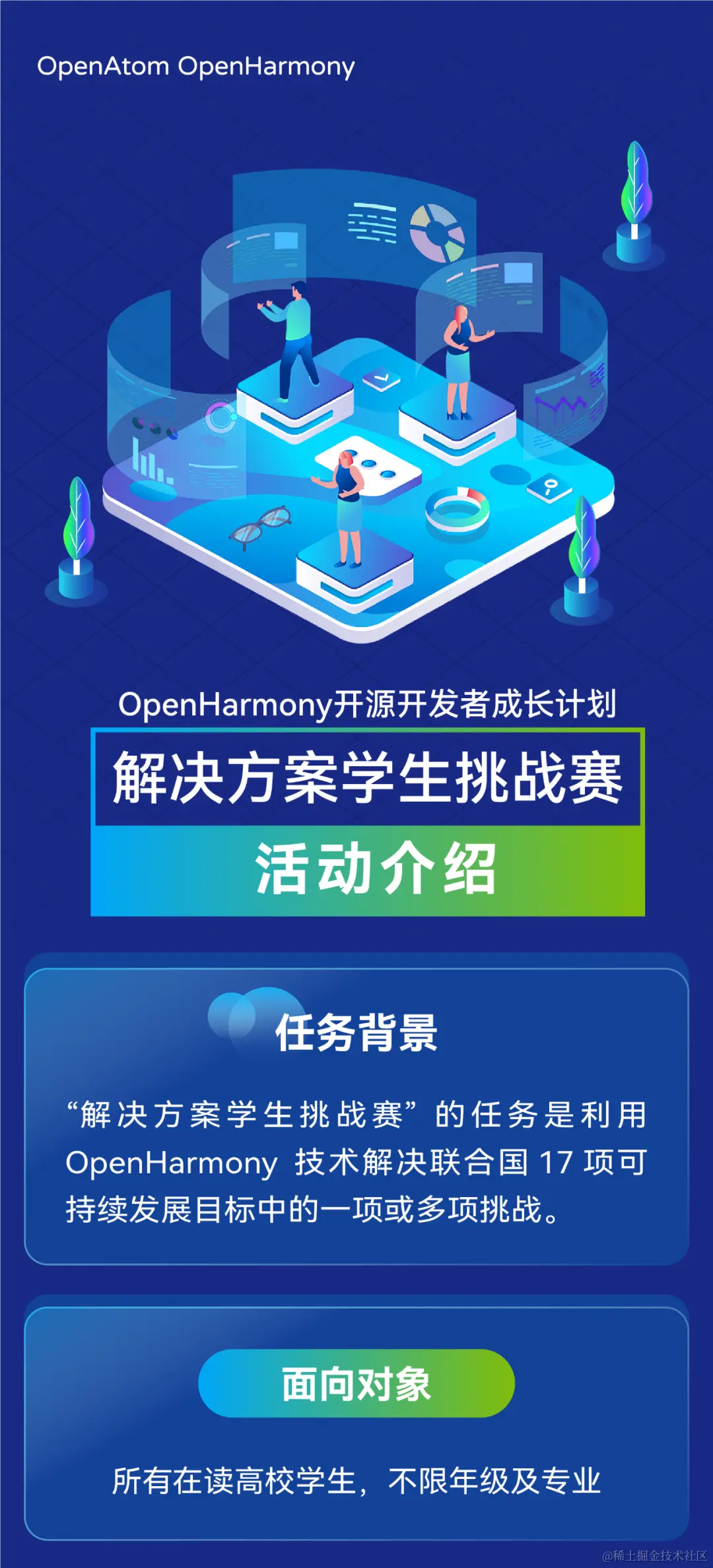 OpenAtom OpenHarmony(以下简称“OpenHarmony)开源开发者成长计划—解决方案学生挑战赛(以下简称“本大赛”或“成长计划学生挑战赛”)的使命是使用OpenHarmony技术解决联合国 17 项可持续发展的目标中一个或多个挑战,鼓励学生开发者积极参与开源软件的开发与创新,帮助开发者在开源项目中成长。
