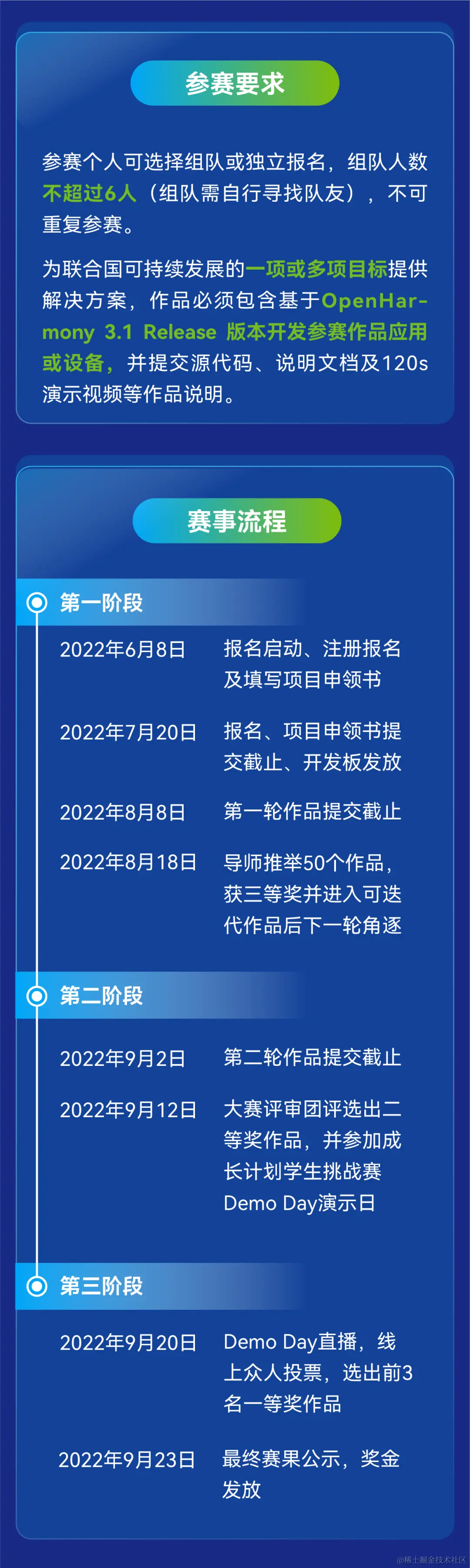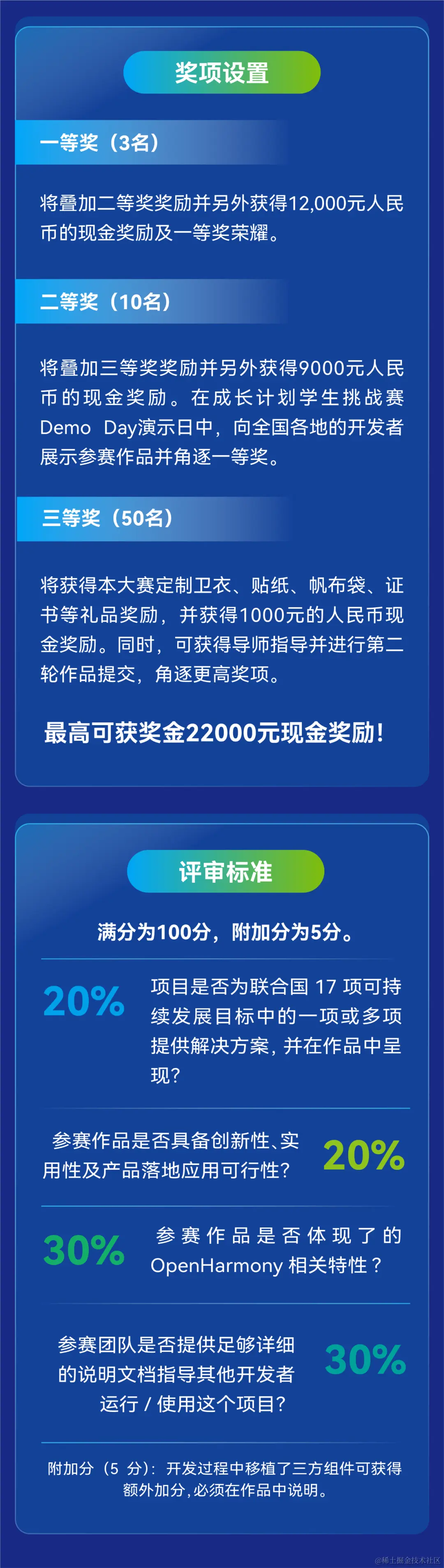 本大赛面向所有在校大学生,注册、认证即可报名参与成长计划学生挑战赛,若组团参赛则人数不得超过 6 人。本大赛为开发者提供 OpenHarmony 开源项目的实践机会及经费资助,并有丰厚奖金及荣誉激励。