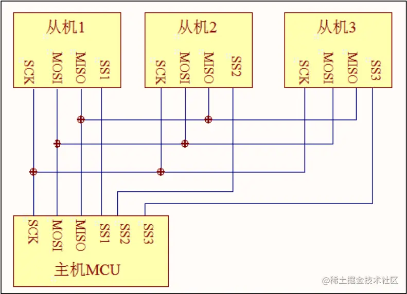 芯片的管脚上只占用四根线。 MISO: 主器件数据输入,从器件数据输出。 MOSI:主器件数据输出,从器件数据输入。 SCK: 时钟信号,由主设备控制发出。 NSS(CS): 从设备选择信号,由主设备控制。当NSS为低电平则选中从器件。