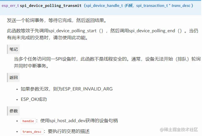 spi_device_polling_transmit()以发送轮询事务。或者,如果要在两者之间插入内容,请使用spi_device_polling_start()和发送事务spi_device_polling_end()。