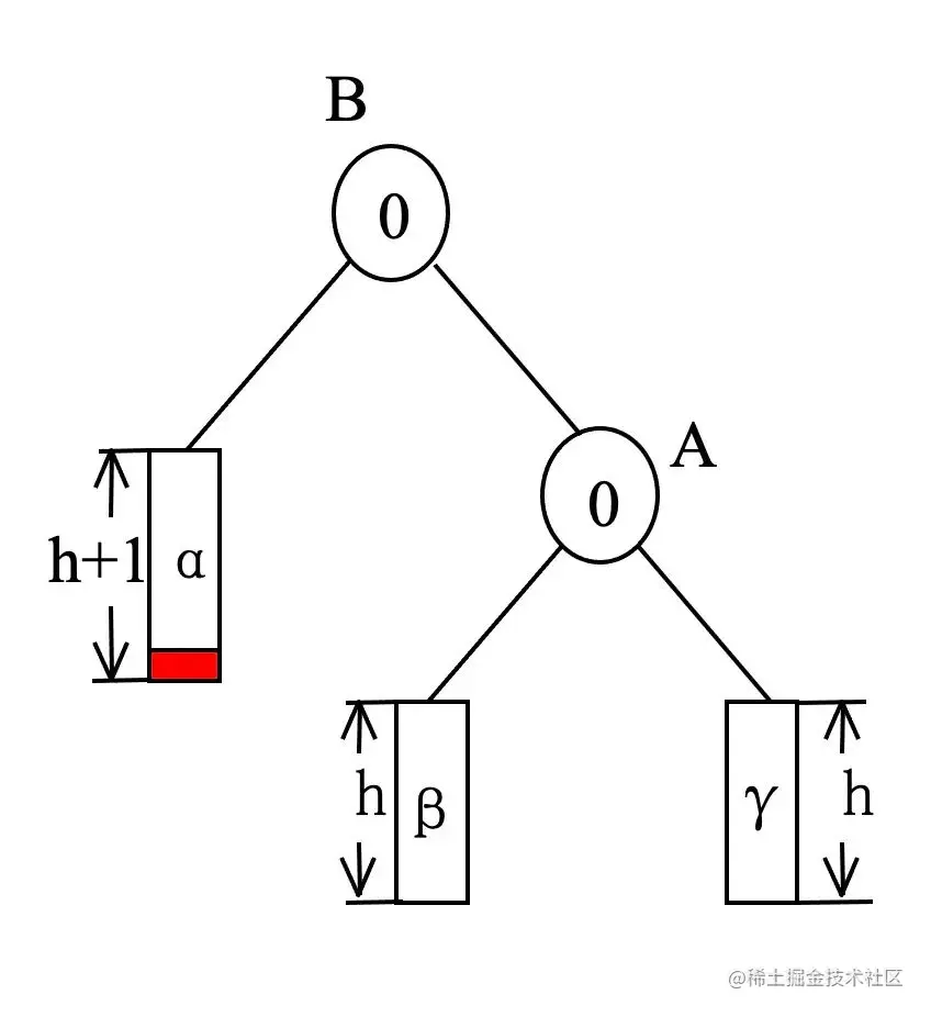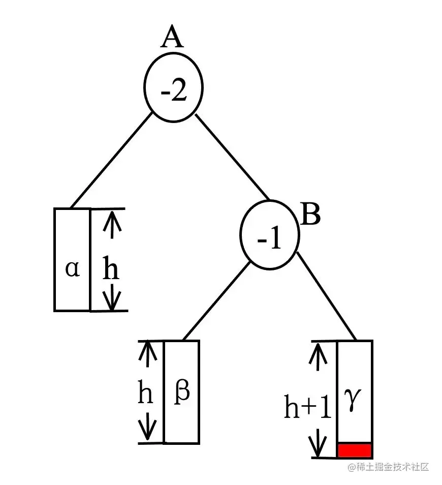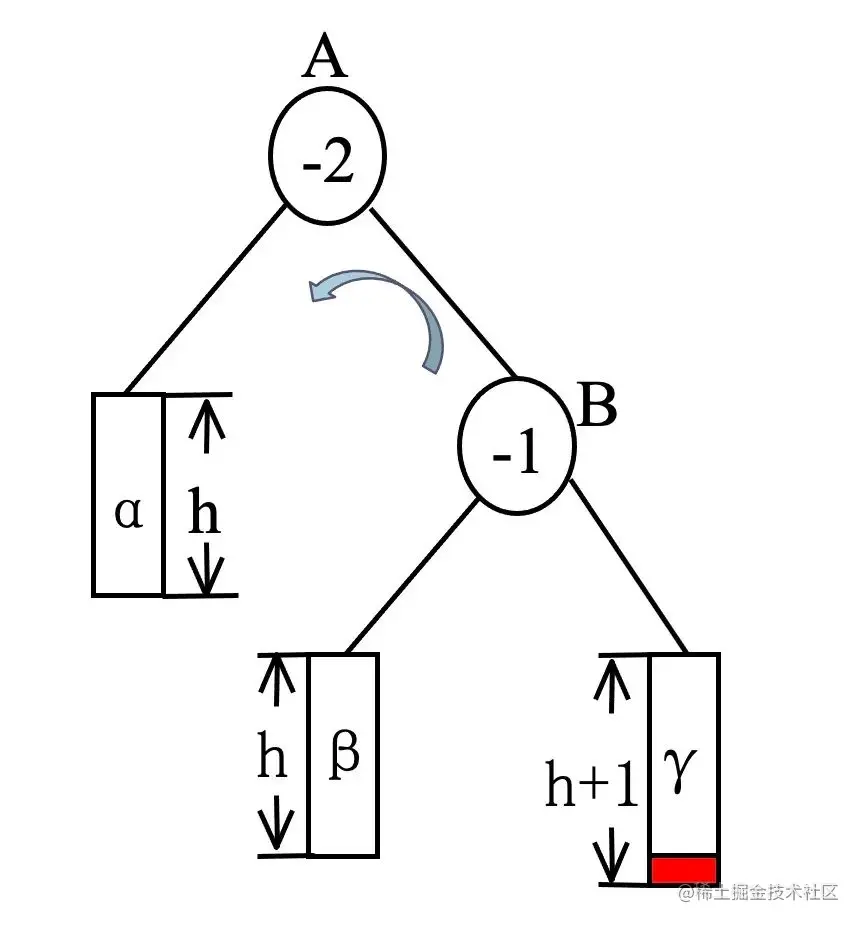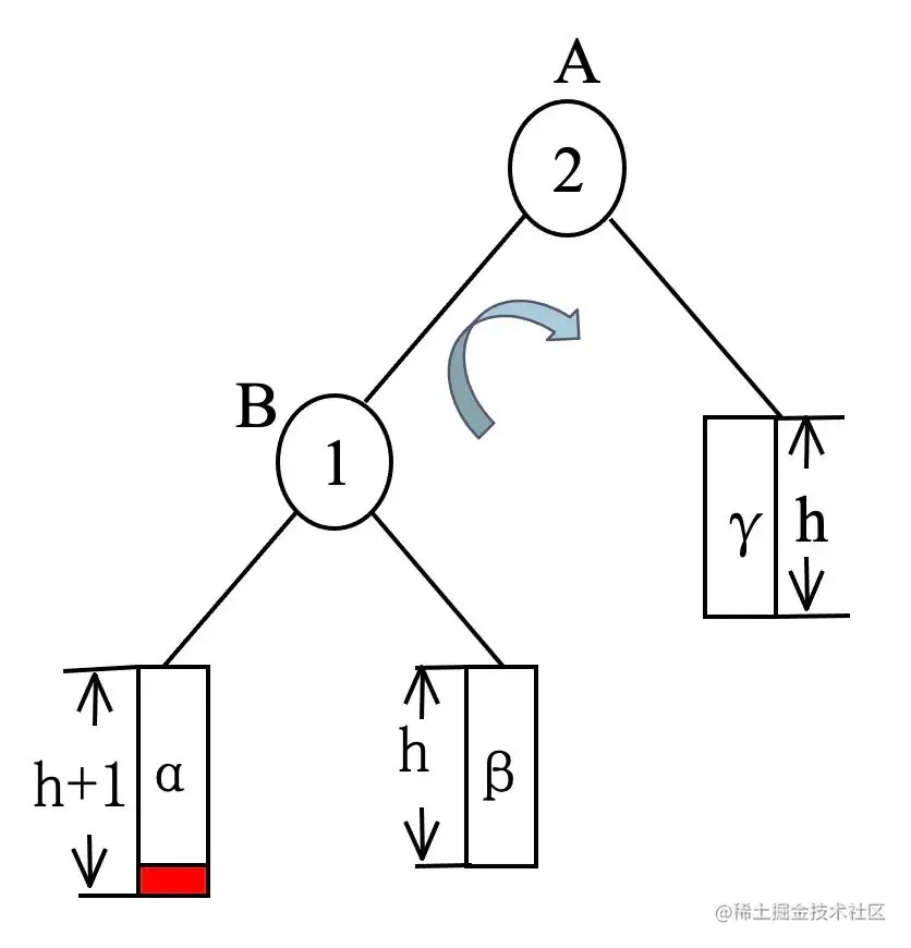LL型调整规则(单右旋转):右旋,将B结点提升为A的父结点,A结点及其右子树变为B的右子树,B的右子树变为A的左子树。