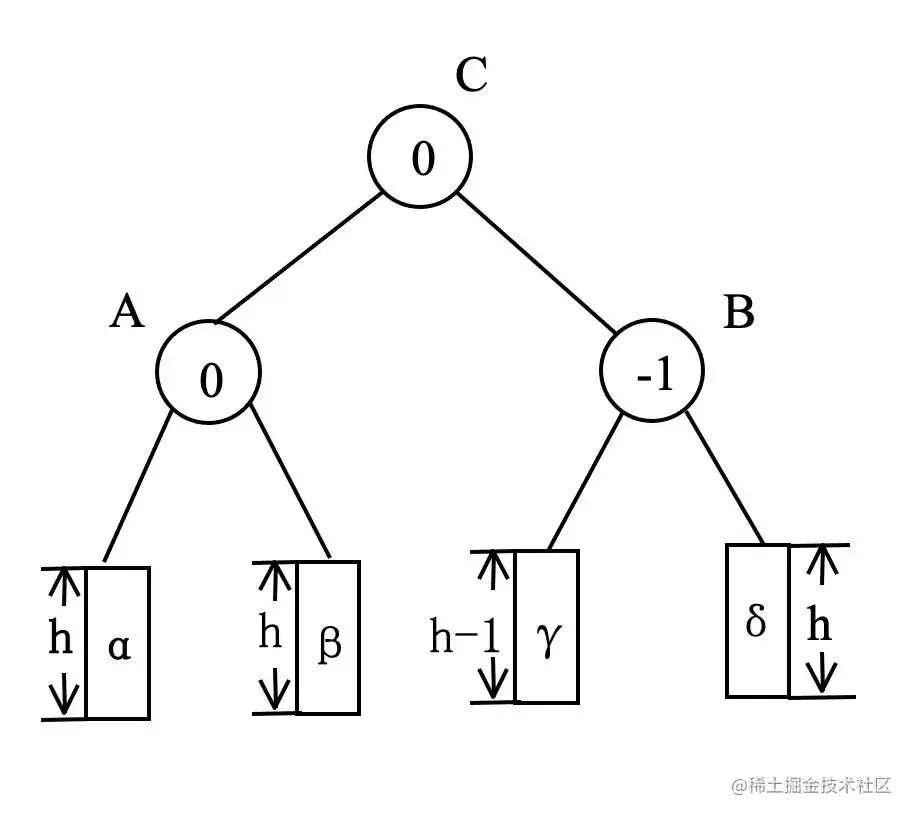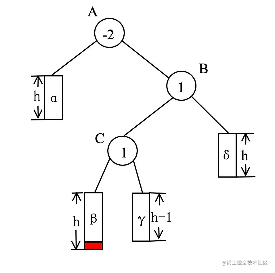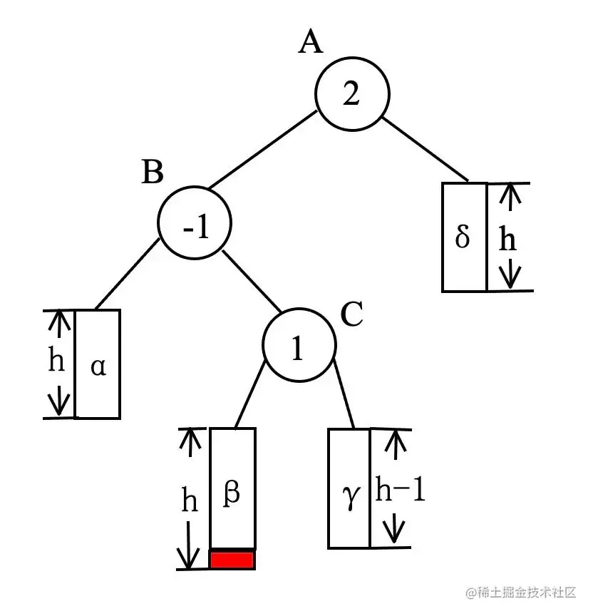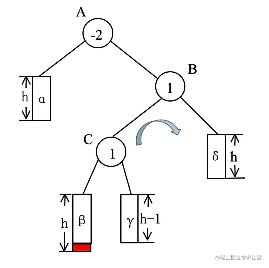 LR型调整规则(先左旋,再右旋):先左旋,将C结点提升为B的父结点,C的左子树变为B的右子树;再右旋,将C结点提升为子树的根结点,A结点及其右子树变为C的右子树,C的右子树变为A的左子树。