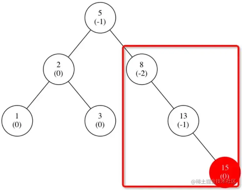 首先需要找到离插入结点最近且平衡因子绝对值大于1的结点,以这个结点为根结点的子树就是最小不平衡子树。然后对这棵最小不平衡子树进行调整。下图这棵树中,最小不平衡子树就是以8为根结点的子树。