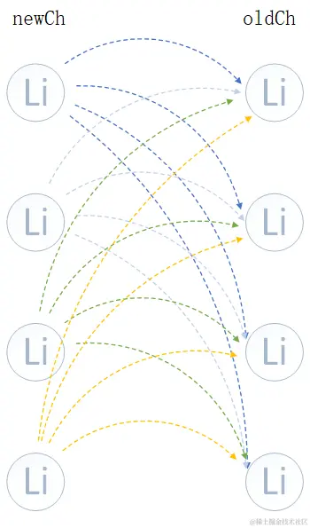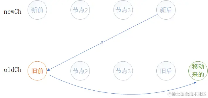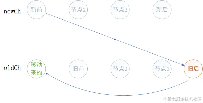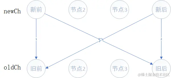 这种对比方式,如果newCh中未处理第一个节点与oldCh中未处理的最后一个节点对比发现相同,那么要参照newCh节点的位置去移动oldCh这个节点的位置。