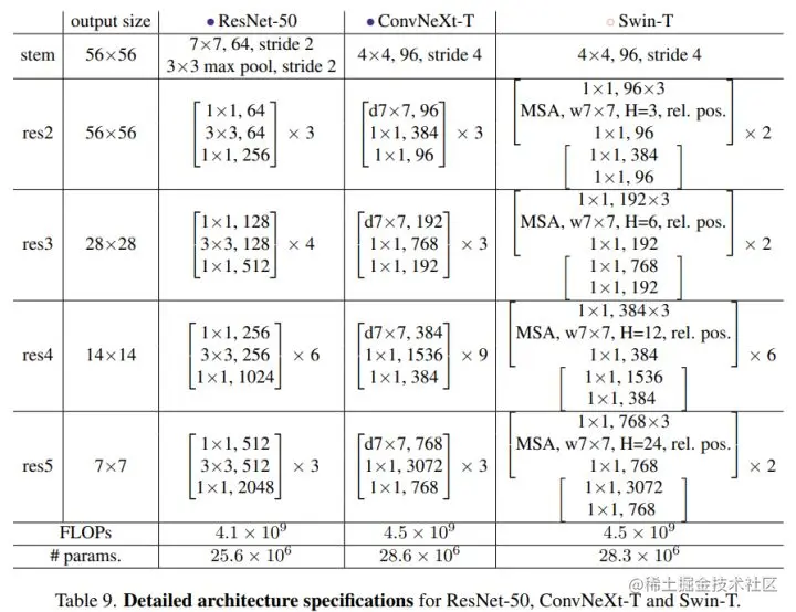 首先是各个stage的计算量占比,对比ResNet50,4个stage的blocks数量分别是(3,4,6,3),而Swin-T的设置为(2,2,6,2),4个stage的计算量比约为1:1:3:1。这里调整ResNet50各个stage的blocks数量以和Swin-T一致:从原来的(3,4,6,3)调整至(3,3,9,3)。