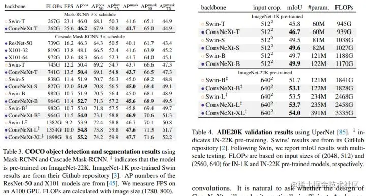 在下游任务检测和分割上,ConvNeXt也可以超过Swin,如下表所示: