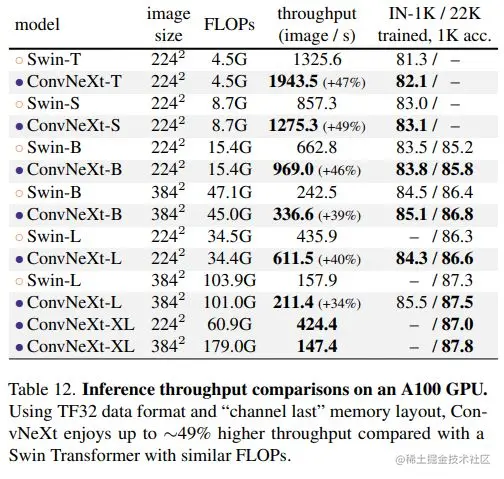 在显存使用上,两者也相当,比如基于ConvNeXt-B的Cascade Mask-RCNN需要17.4GB peak memory,而Swin-B 需要18.5GB。另外,如果在A100上(支持TF32),采用channel last,ConvNeXt相比Swin有明显的速度优势: