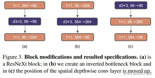 inverted bottleneck最早在MobileNetV2中提出,随后的EfficientNet也采用了这样的结构。ResNet50采用的是正常的residual bottleneck,这里将其改成inverted bottleneck,即从图(a)变成图(b),虽然dw conv的计算量增加了,但是对于包含下采样的residual block中,用于shortcut的1x1 conv计算量却大大降低,最终模型的FLOPs减少为4.6G。这个变动对ResNet50的影响较小(80.5%->80.6%)。