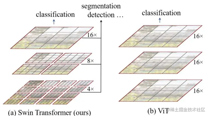 对于ViT模型,其 patch size一般较大(eg. 16),只采用一个stride较大的conv来做patch embedding往往会存在一定问题,比如Mocov3论文中就指出patch embed可能会导致训练不稳定,而论文Early Convolutions Help Transformers See Better指出将 patch embed 设计成几个堆叠的 stride=2 的3*3 conv,无论是在模型效果上,还是在训练稳定性以及收敛速度都更好;而Swin-T的 patch size相对较小,不会出现ViT的上述问题,不过Swin-T采用的是 non-overlapping conv,后面有论文指出采用overlapping conv(eg stride=4 的7x7 conv)会带来一定的性能提升。