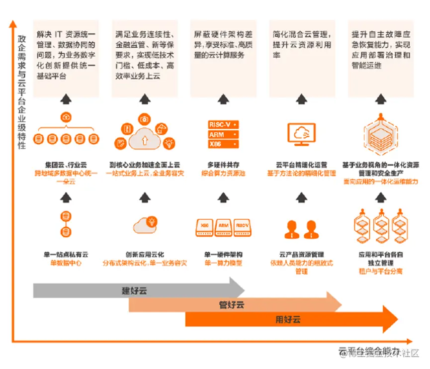 在和各行各业的政企客户深度交流中,我们发现“应用部署治理和智能运维”是影响客户应用全面上云最重要的因素。以往,云厂商的注意力往往更多基于技术操作的自动化设计思路构建大量的工具,但是我们真正需要做的是为政企的运维治理及流程自动化负责。这意味着,我们不仅要帮助政企“管理”好云平台,从云资源层面的基本管理发展到云平台层面精细化运营,还要帮助政企来做云上应用系统的统一管理与运维。
