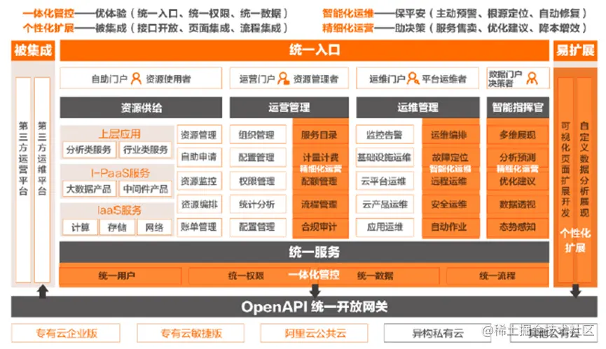 - Apsara Stack 2.0 在帮助政企统一运维和运营管理方面,主要从4个方面进行了加强,分别是一体化管控、智能化运维、精细化运营和个性化扩展,集中来实现两个目标:一是深度整合,以标准化的方式被集成到政企已有的管理体系中;二是数据驱动,通过自闭环方式的持续提升和优化管好云的方法论。我们从政企的业务流程开始分析,从云上资源规范到应用的部署架构,沉淀出了一整套最佳实践,并通过逐步将最佳实践固化在平台产品中的思路,帮助政企完成应用上云的工作,我们称之为“面向应用的一体化运维”,这里的“一体化”,主要包括“租户+平台一体化”“应用+专业一体化”“云上+云一体化”“敏态+稳态一体化”