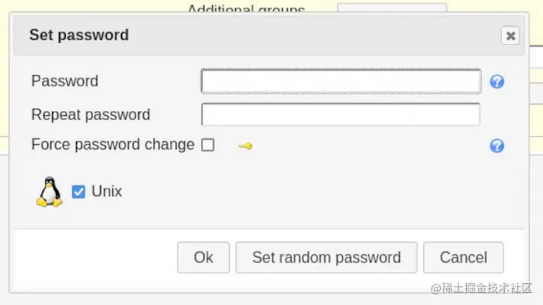 在Unix标签上,确保点击设置密码。当出现提示时**(图F**),输入并验证新的密码,然后点击OK。