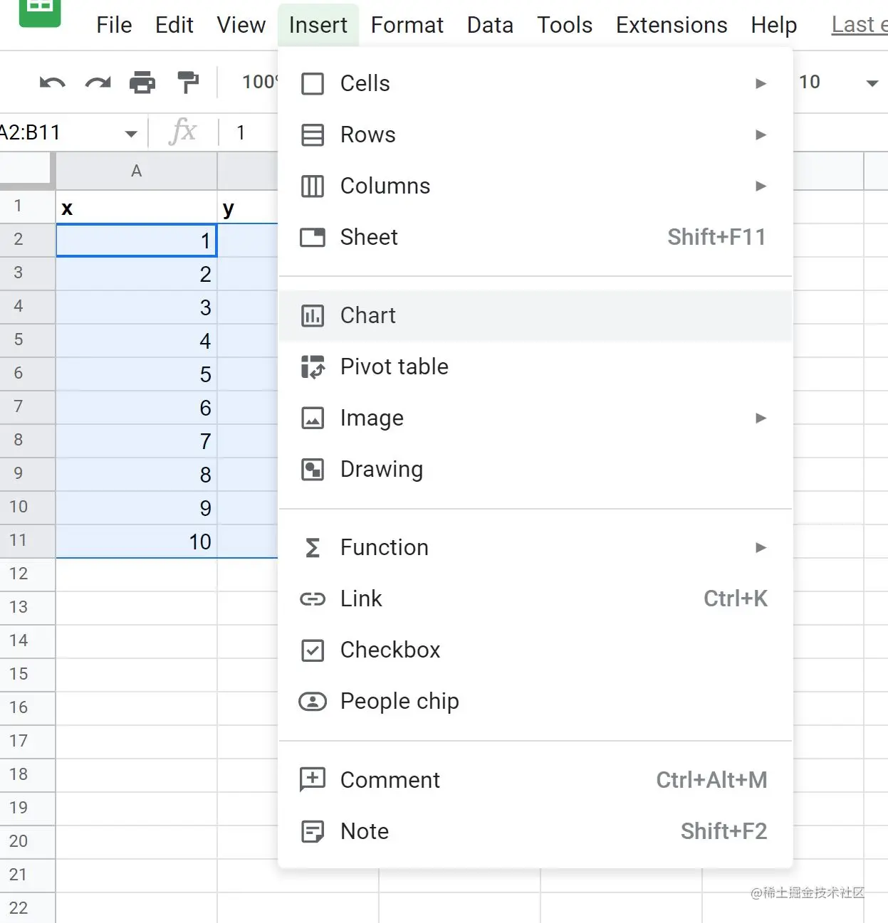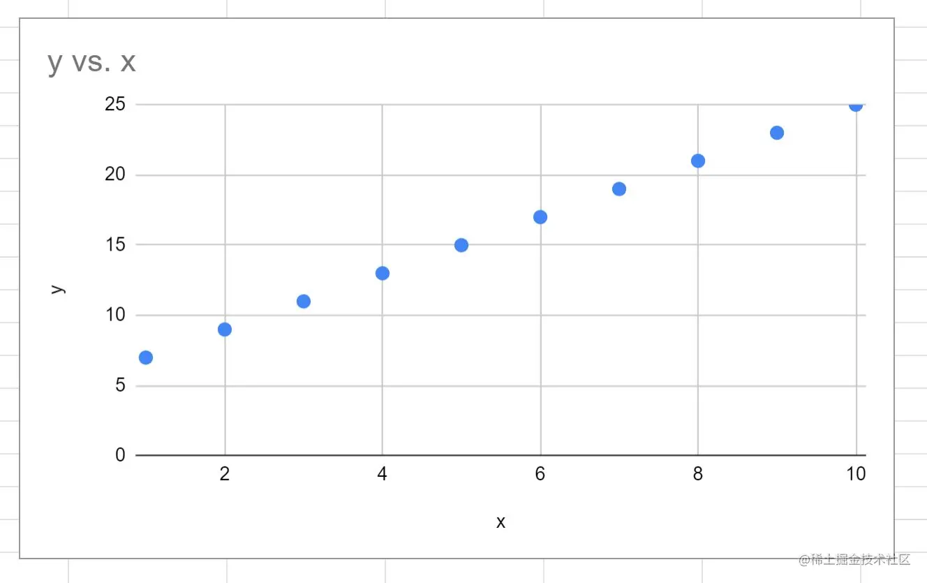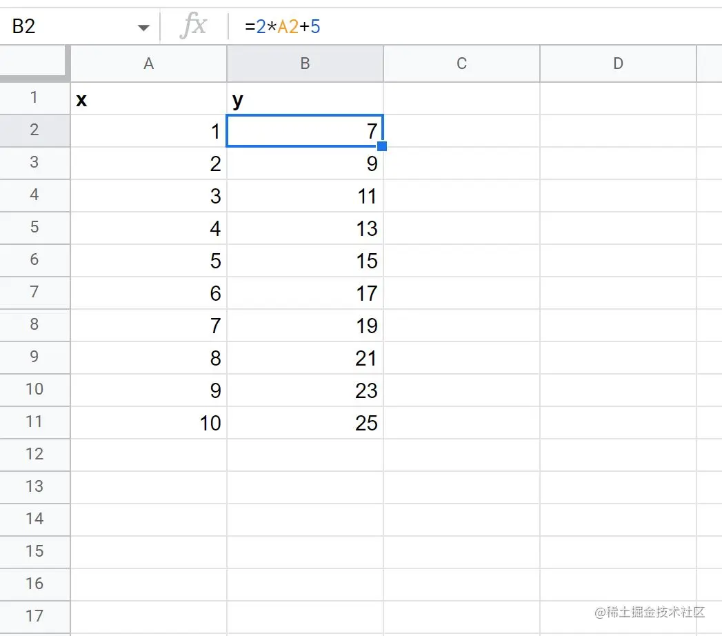 下图显示了如何在谷歌表格中为这个线性方程创建Y值,X值的范围是1到10。