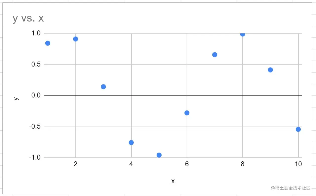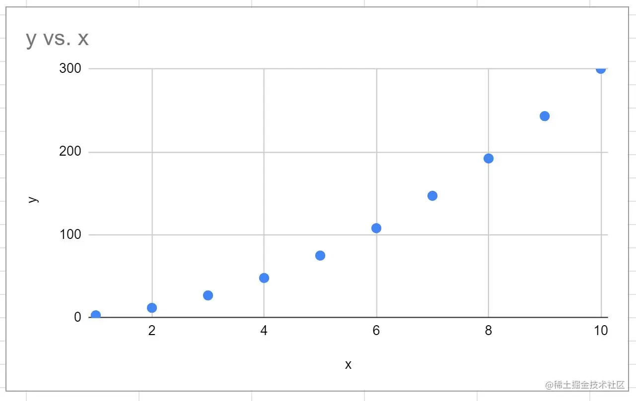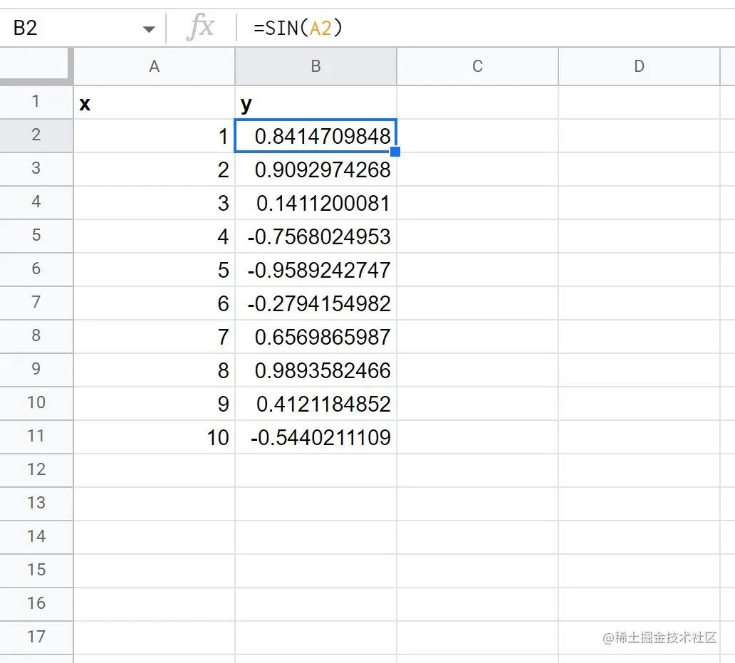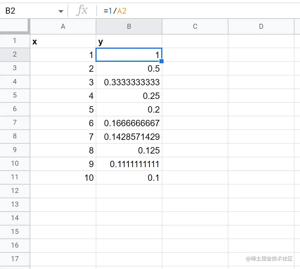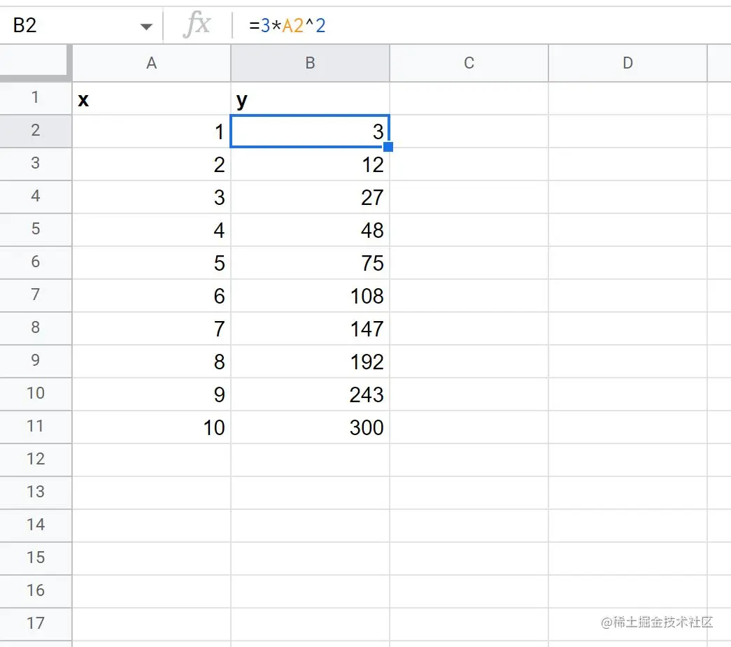 下图显示了如何在谷歌表格中创建该方程的y值,x值的范围为1到10。
