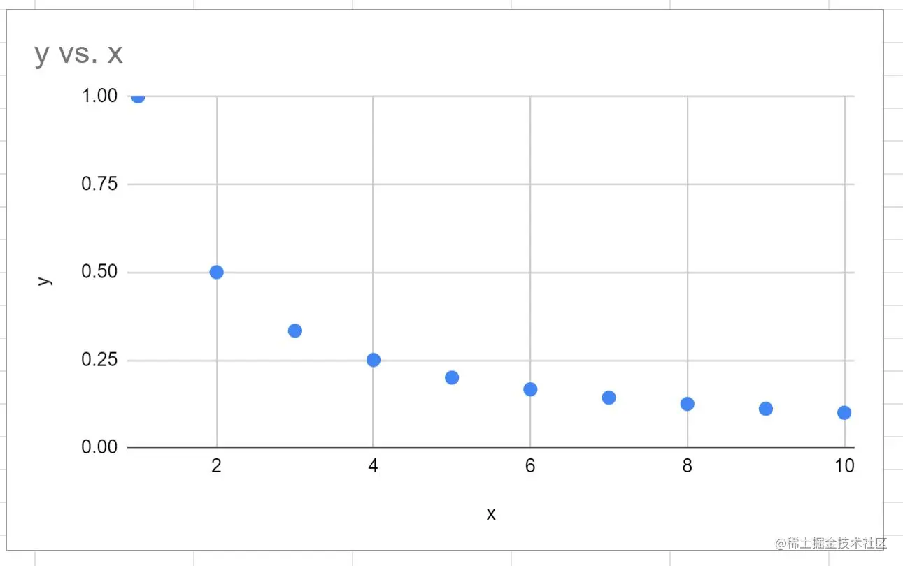 我们可以看到,该图是沿着一条向下的弧线绘制的,因为这代表了方程y=1/x。